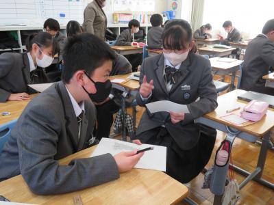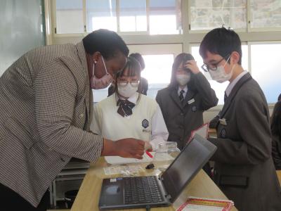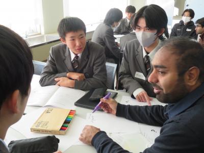 中学3年生は国際探究を進めており、各グループが堂々とテーマや仮説についての発表を行っていました。