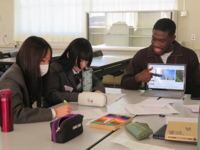 今回はガーナ、韓国、中国、フランス出身の4名をお招きし、各国の紹介をしていただいた後、各自の探究活動の情報収集のためのインタビューを実施しました。
