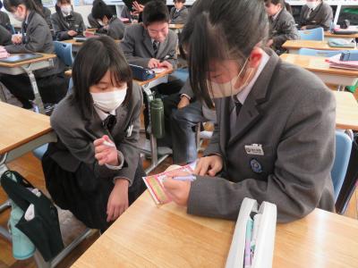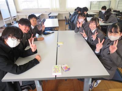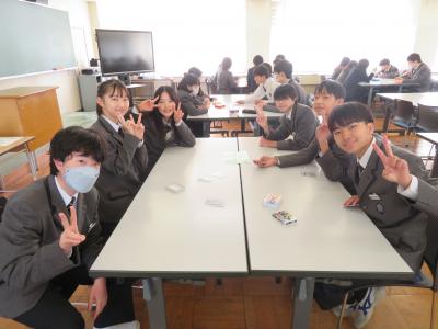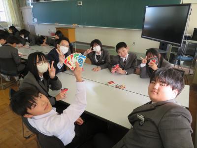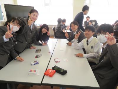 2学年の学活の授業の様子です。レク係の生徒が仕切りながら、6人グループでカードゲームをしました!